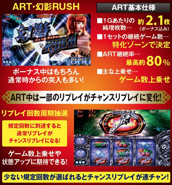 ユニバーサルブロスブランド第2弾の『SLOTシャドウハーツⅡー運命の道標ー』は、ループ式ART「幻影RUSH」が出玉増加の肝。主な突入契機はボーナス及びチャンス役となるが、幻影ボーナス時はART方式を自ら選択できる点が特徴である。 その選択肢は幻想・運命・審判・裏審判の4種類で、裏審判はMAXベット長押しで選択が可能。基本的にART当選期待度が低くなるほど突入した際の継続期待度がアップする。 |
