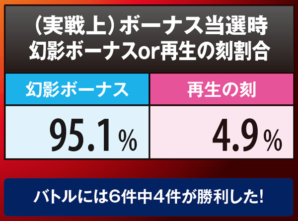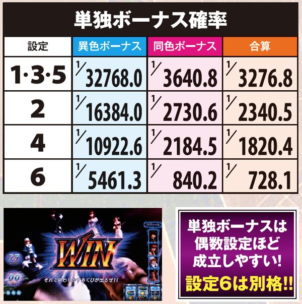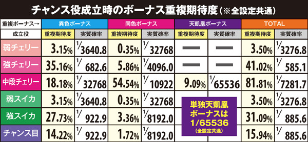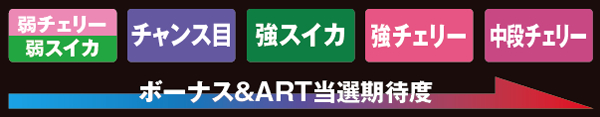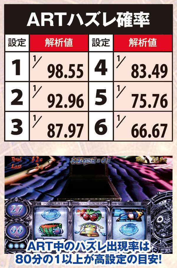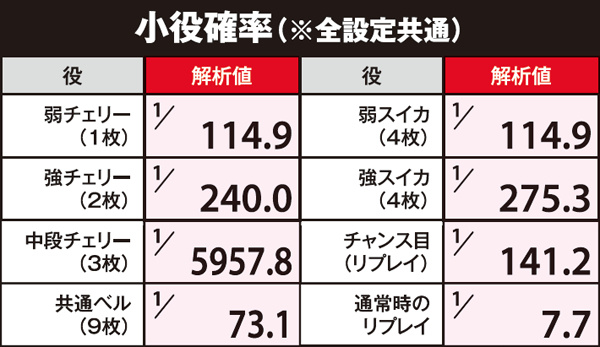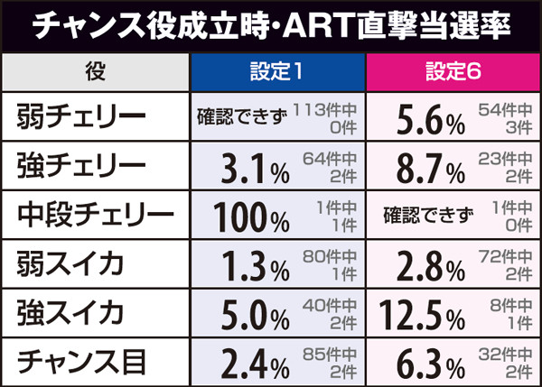 チャンス役は全6種類で、ボーナス&ARTのメイン契機は強チェリーや強スイカ。また、ボーナス単独当選割合は実戦上、設定1よりも設定6の方が高く、その差は約3倍の開きが生じた。