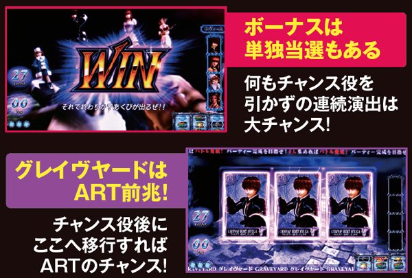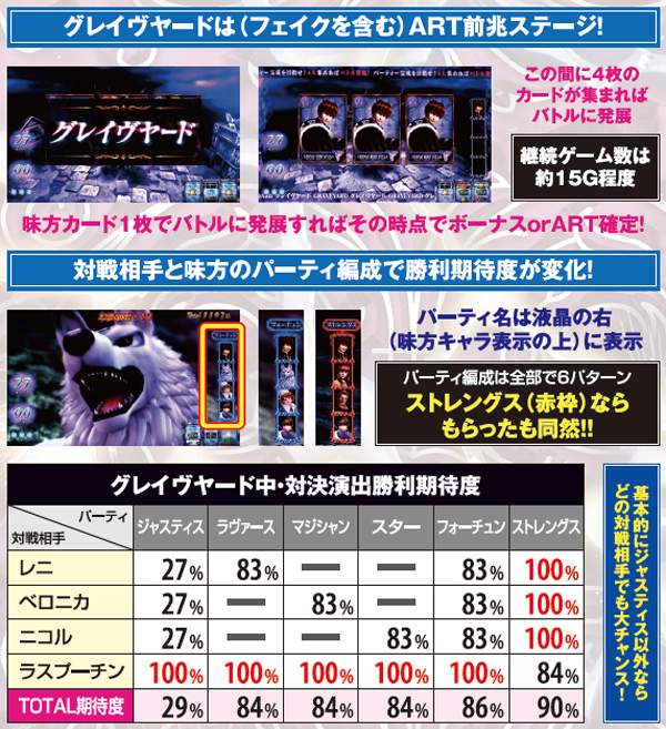 グレイヴヤードへの移行はフェイクを含む前兆が確定し、味方カード1枚でのバトル発展は問答無用でボーナスorART確定。バトル時は対戦相手と共にパーティ編成も重要で、基本的にジャスティス以外が選ばれれば勝利に大きな期待が持てる。