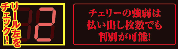本機は基本的にフリー打ち消化でOK。チェリーやスイカの強弱、チャンス目の成否は停止型や効果音で見極められるが、チェリーに関しては払い出し枚数からの見極めも可能だ。