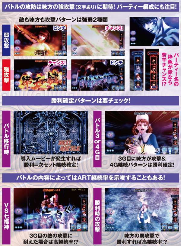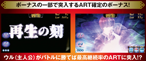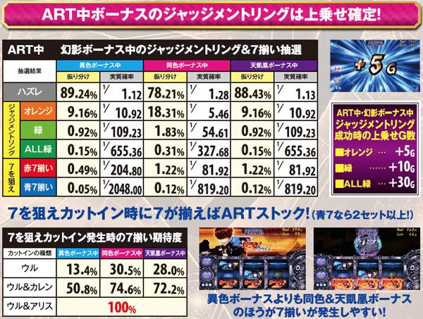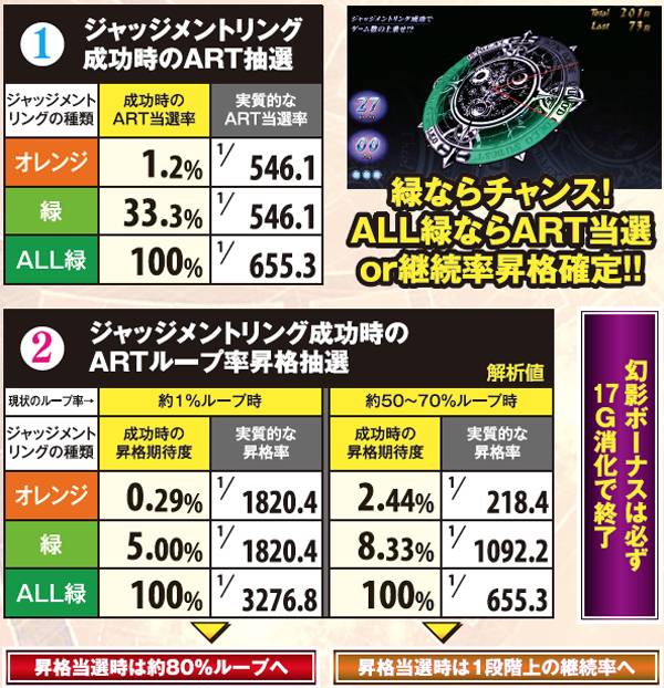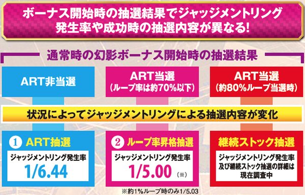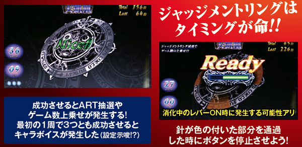 通常時のボーナス中はジャッジメントリング成功でART抽選が行われ、その当否はバトルでジャッジ。ART中のボーナス中はジャッジメントリング成功で5G以上のゲーム数が上乗せされる。