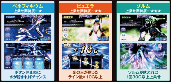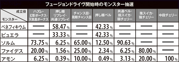 実戦上ファイデスは最低50G、アモンは最低150G上乗せ。大半はソルム以下が選ばれるが、継続中にチャンス役を引ければ上乗せゲーム数が優遇され、ボーナス当選時はボーナス後にフュージョンドライヴが再セットされる。