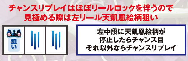 チャンスリプレイはリールロック成立時、左リールに天凱凰絵柄を狙うことで見極めが可能。