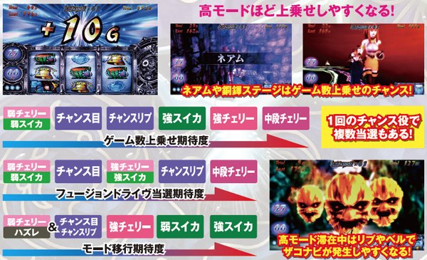 少ない規定回数が連続で選ばれた場合のチャンスリプレイ頻出による上乗せの連打は、本機における魅力の一つ。チャンスリプレイはフュージョンドライヴ突入契機でもあるので可能性は無限大だ。