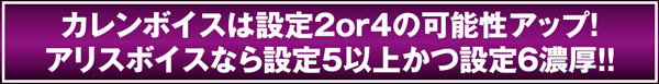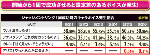 ジャッジメントリング1周成功時に発生するキャラボイス選択割合には設定差が存在するので、チェックは必須。ただし、失敗すると各種抽選や上乗せを受けられないので、慎重にタイミングを計ろう。