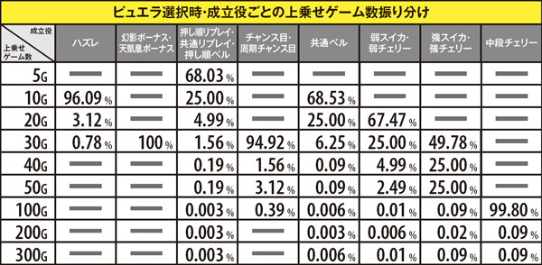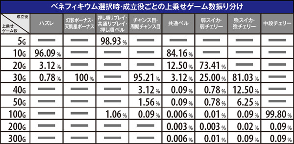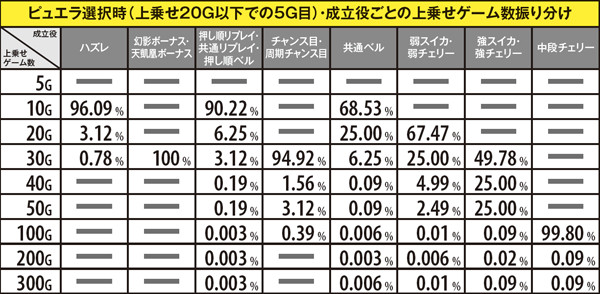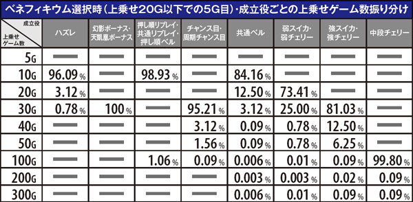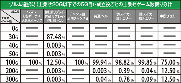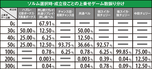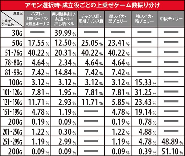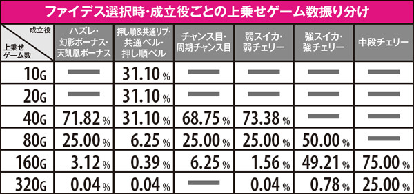 ※フュージョンドライヴ1回あたりの上乗せ保証ゲーム数は30Gなので、4G目までの時点で20G以下だった場合は別の専用テーブルで上乗せゲーム数の抽選を行う