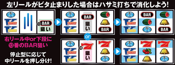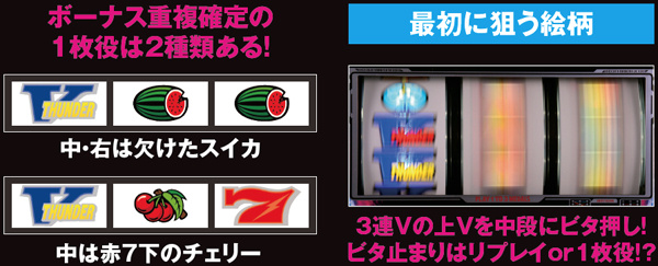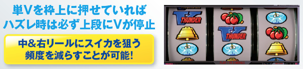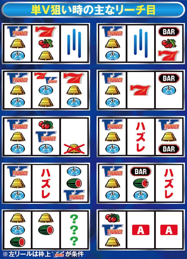 左枠上に単独Vを狙う手順。左リールに4個配置されたV絵柄を見分ける必要があるが、第1停止でスイカを否定することも多いので、赤7狙いより目押し頻度が少なく済む。初代サンダーVではスタンダードだった。