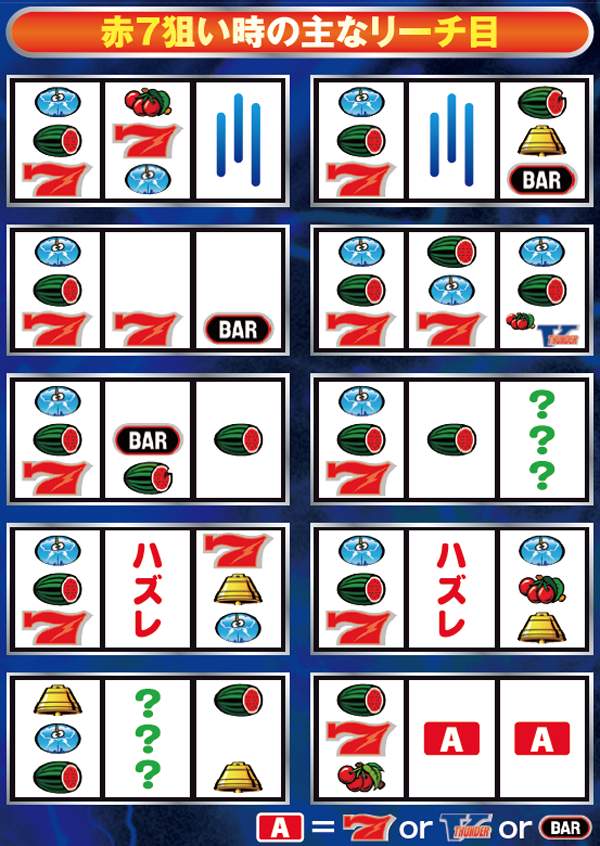 いわゆる赤7チェリー落とし。ほぼ毎ゲームスイカ目押しを要求されるが、もちろん左→中でスイカがテンパらなければ右の目押しは不要となる。スイカ目押しの頻度が多いぶん、初心者は左枠上V狙いを実践した方が無難だ。