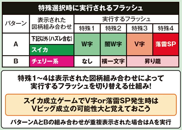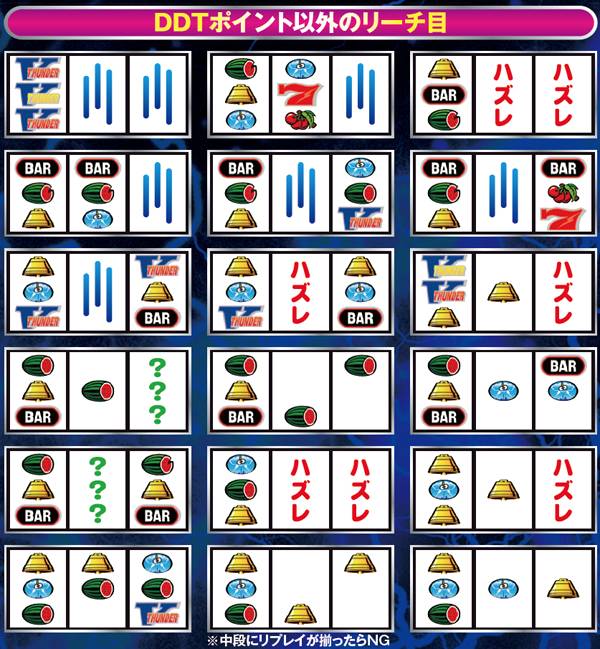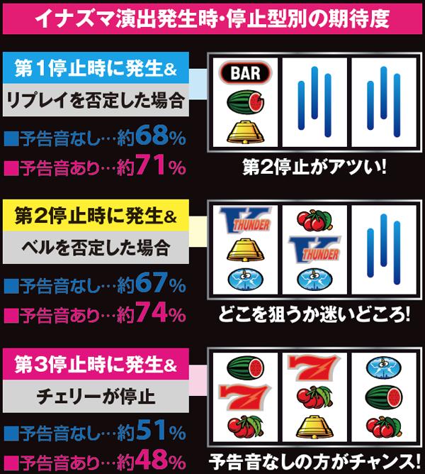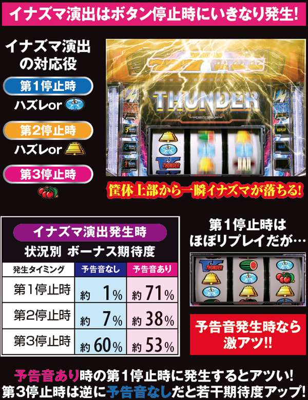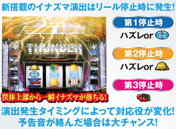 新搭載のイナズマ演出は発生タイミングが小役に対応している。具体的な内容は上記の通りだが、第1&第2イナズマは対応役がハズれてもボーナス確定ではない(ただし期待度は高い)。第3イナズマはチェリーを否定すれば鉄板となるので遭遇するとかなり驚く。