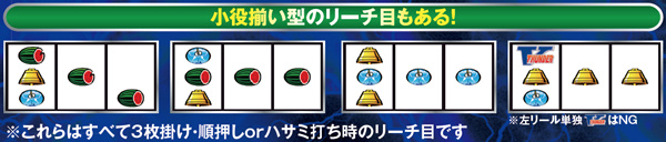 上記の出目は、左リールの停止型別にまとめた大量リーチ目の一部抜粋である。本機は純粋なボーナスタイプにつき変則打ちにペナルティはないが、中押し&右押しによる出現は基本的に無効となる。