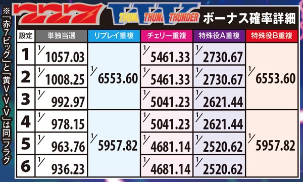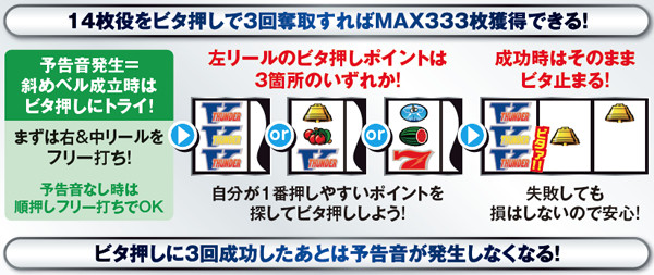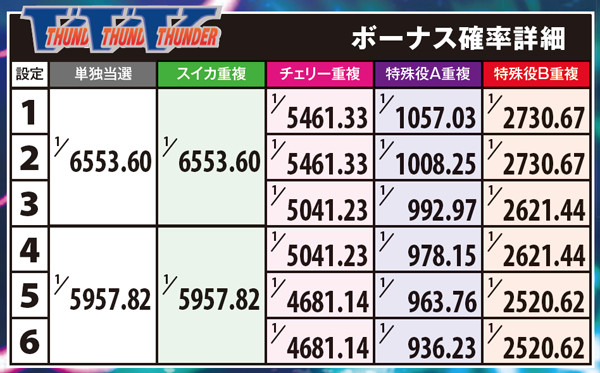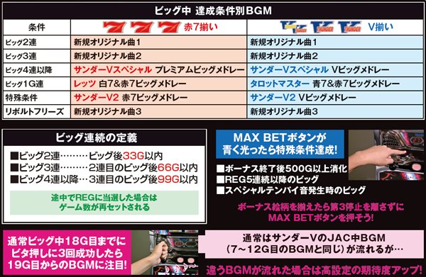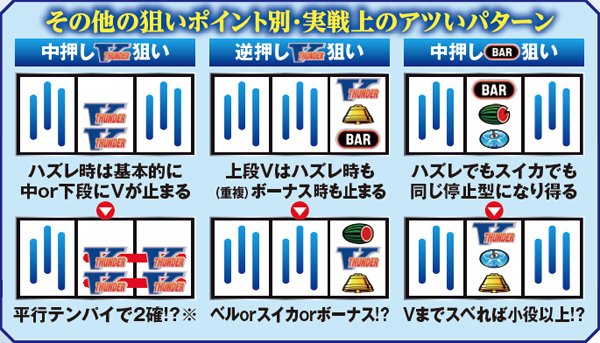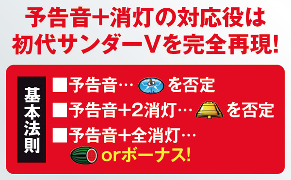 予告音&消灯と出目の絡みに一喜一憂するのがサンダーVの正しい楽しみ方である。そのためにも成立役に対応した演出法則をしっかりと覚えておかねばならない。ちなみに、フラッシュ発生時に小役を否定したならボーナス確定だ。