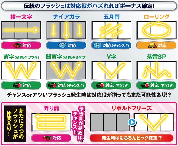 ボーナスはリーチ目で察知することが多いが、チェリー・リプレイ・スイカと重複することもある。その際にはレアなフラッシュが発生しやすい。また、フラッシュの対応役ハズレ&非対応役揃いは無条件でボーナス確定だ。