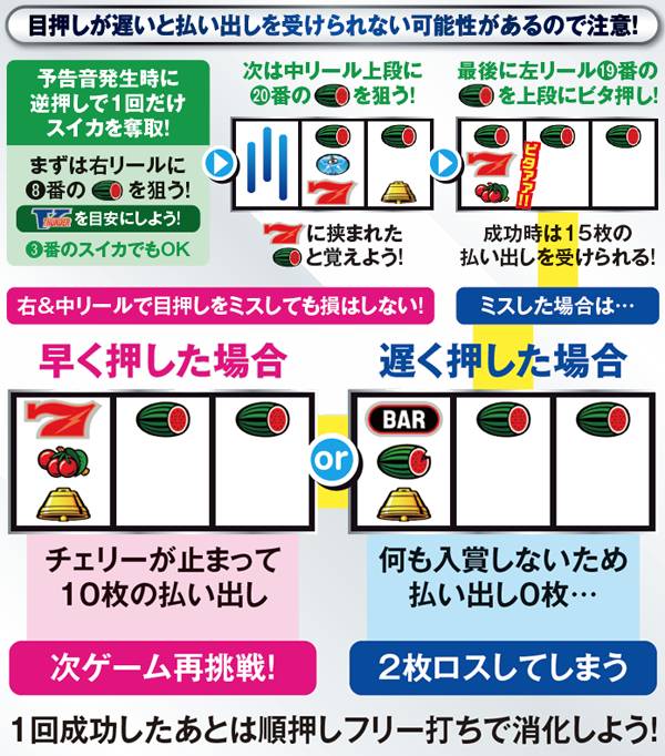 スイカ成立時には可能なかぎり有効ラインに引き込む。枠内にチェリーが出ようと御構い無しなので、左を押す位置によってはチェリー付きでスイカが揃うことになる。取りこぼしは大損なので要注意だ。