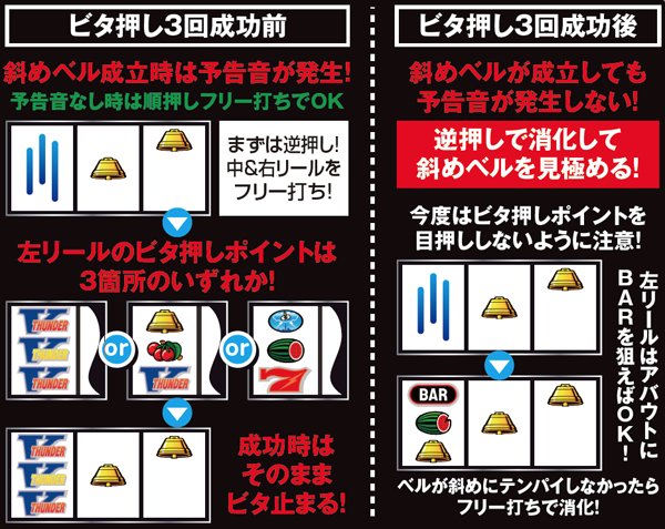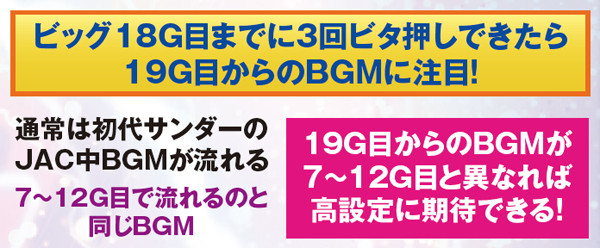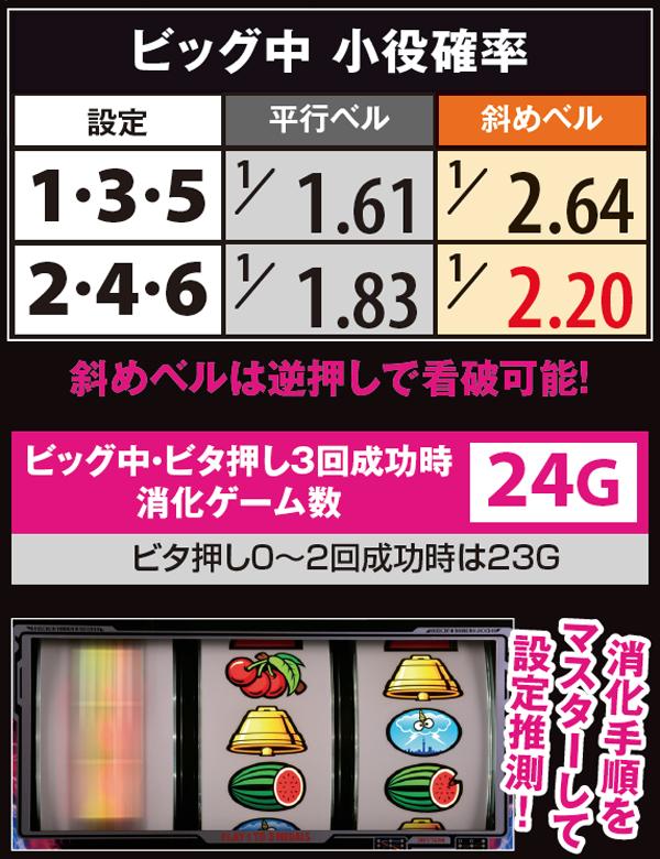 ビッグ中にビタ押しを3回成功させると予告音が発生しなくなるので、以後はオール逆押しで斜めベルをカウントしよう。サンプルを集めれば設定の偶奇判別に活用できる。設定1or6営業のようなメリハリのあるホールでは効果抜群だ。