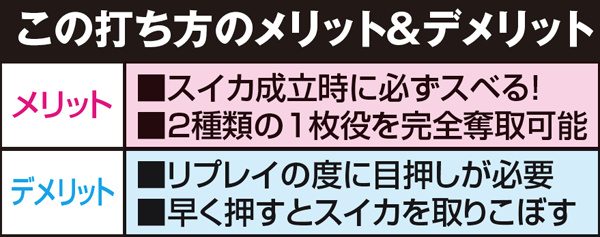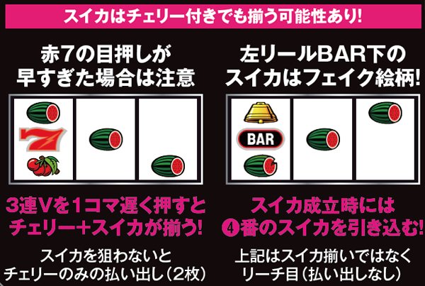 この打ち方を毎ゲーム実践すれば、通常は取りこぼす重複確定の1枚役をすべて奪取できる。ただし、要求される目押し力はビタ押しレベル。労力に見合う効果は得られないのでほかの打ち方で十分だろう。また、スイカがチェリー付きで揃うのだが、この時中&右リールにスイカを狙わないとチェリー(2枚)の払い出しになる。それならスイカ成立時に単Vを上段にビタ押しした場合もチェリーを引き込むのかと言うとそうではなく、単V上と赤7下にあるチェリーは絵柄が違うため、単V上段ビタ押し時は純粋にスイカを取りこぼすことになるのだ。