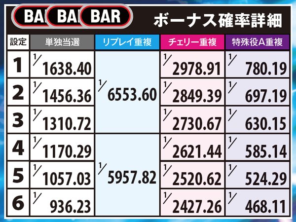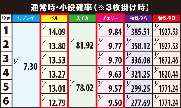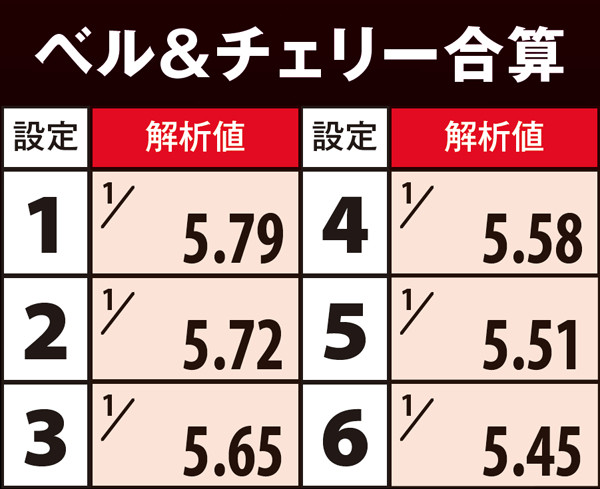 ベル&チェリーは合算で算出。早期判断は危険だが、2000G程のサンプルが集まれば設定推測の指標の一つとして大いに活用できる。