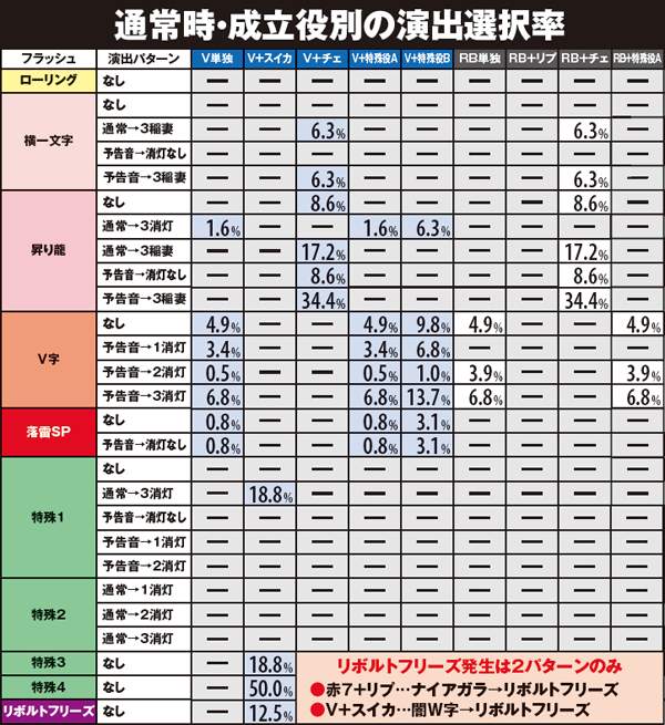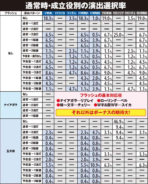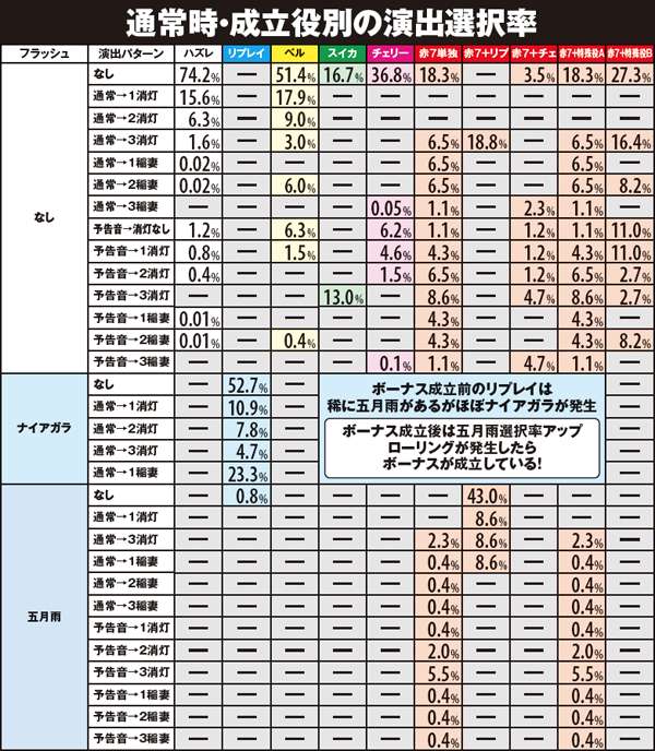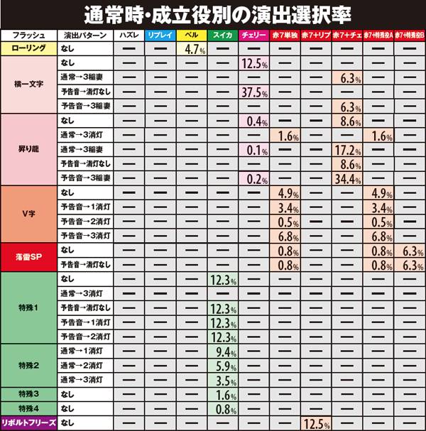 演出選択率はあくまでも非ボーナス成立中およびボーナス成立ゲームとなっており、ボーナス成立後はハズレで五月雨や闇W字、V字フラッシュなども発生する。また、ベル揃いからW字、チェリーから闇W字発生もボーナス成立後確定となる。上記のリプレイでローリング発生と合わせて覚えておこう。