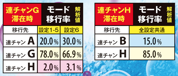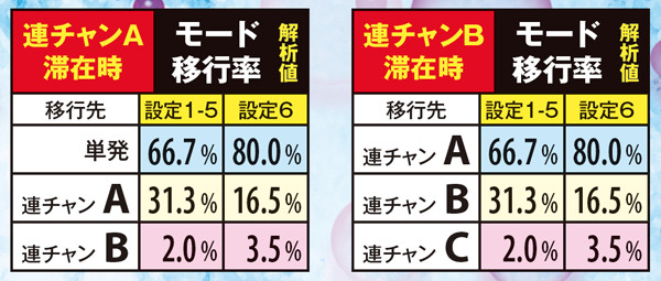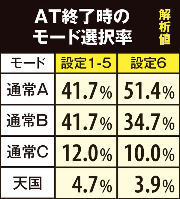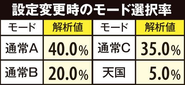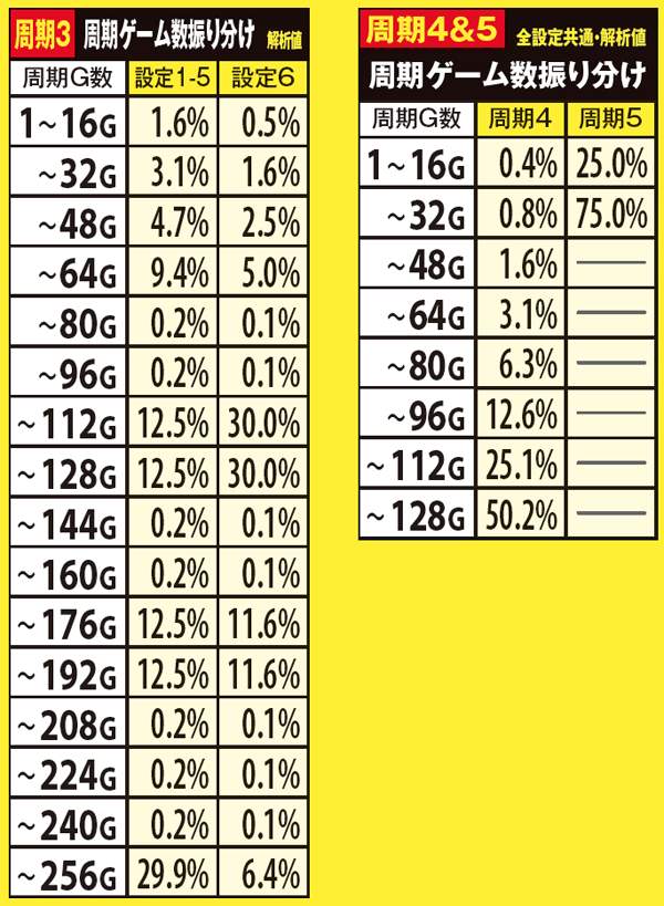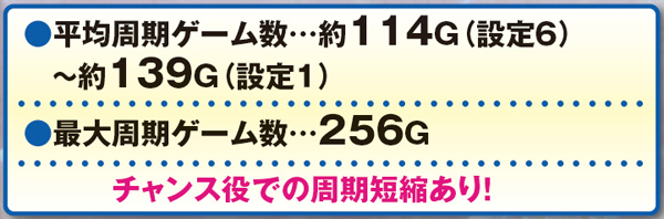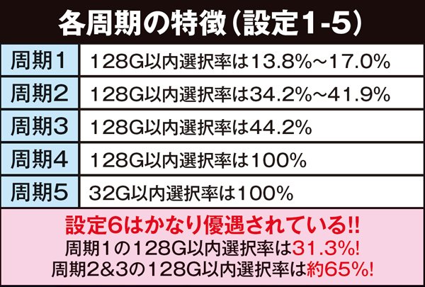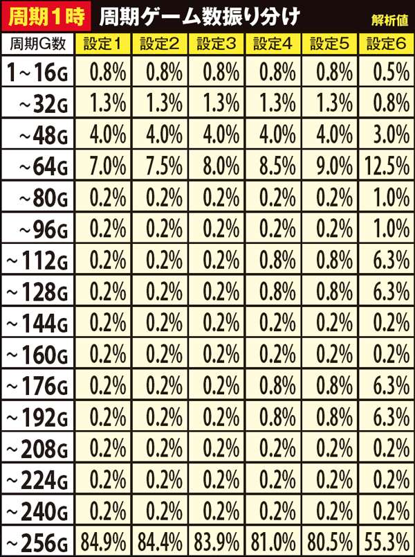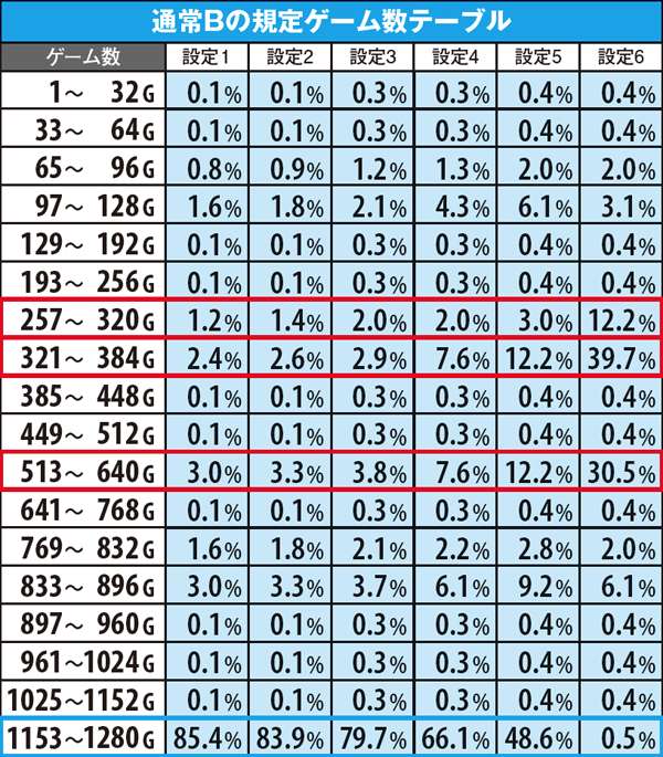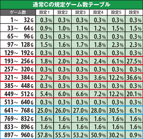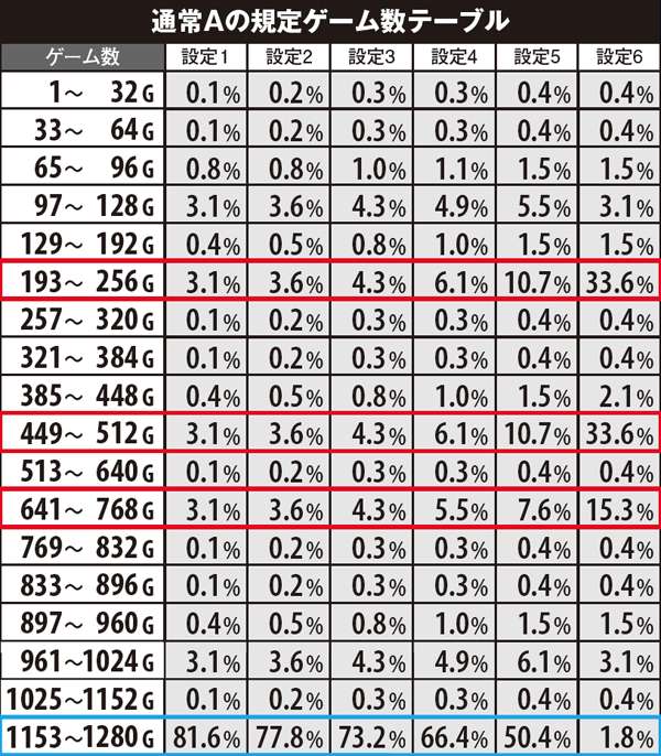 3つの通常モードによって規定ゲーム数振り分けは異なっているものの、193~256G、321~384Gなど、特定のゲーム数でのゲーム数当選が複数回あれば、それだけで設定6と言い切れるほどあからさまな振り分けとなっている。