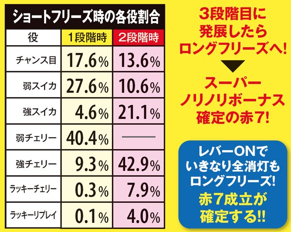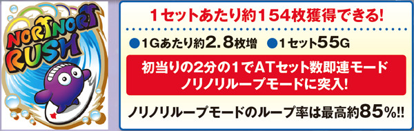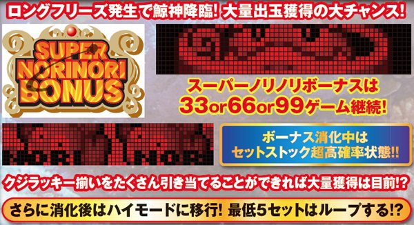 ロングフリーズ発生時は超高確率でセット数ストックが行われるスーパーノリノリボーナス当選となる。ボーナス後はハイモードに移行するのでループによる大連チャンにも期待できる。