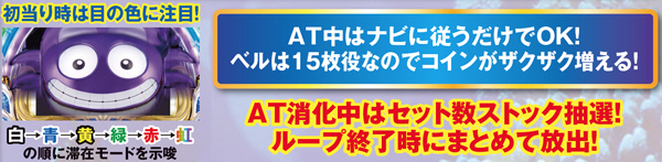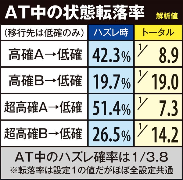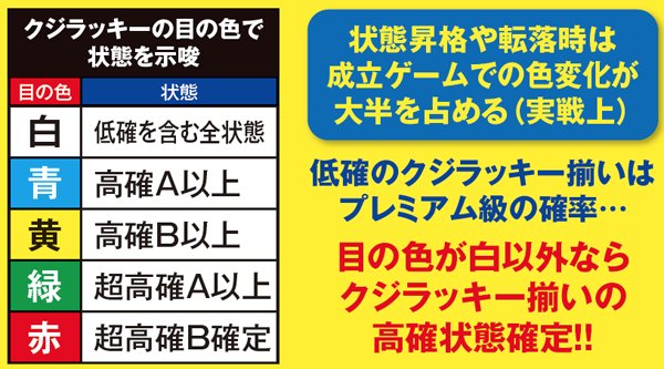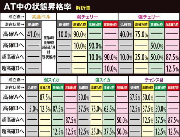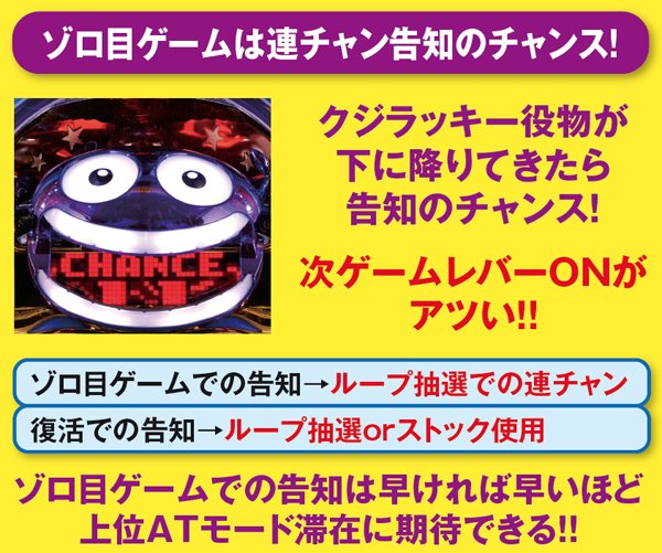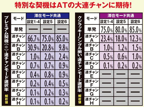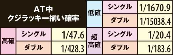 AT消化中はハズレが4連続以上した場合はストック抽選が行われるものの、4連続での当選率は約0.2%、5連続で約0.4%、6連続以上でも約4%である。ただし、当選時はほぼクジラッキーシングル揃いと同じ連チャンモード振り分けとなる。また、強スイカは1%でプレミアム契機の振り分け、強チェリーは1%でクジラッキーシングル揃いと同じストックを獲得できる。ということで、AT中のチャンス役の主な役割はやはり状態アップ。チャンス役で(超)高確に上げ、クジラッキー揃いを引くことがATストックのメインルートなのである。