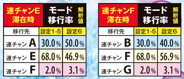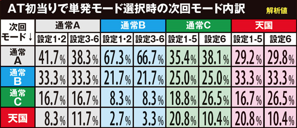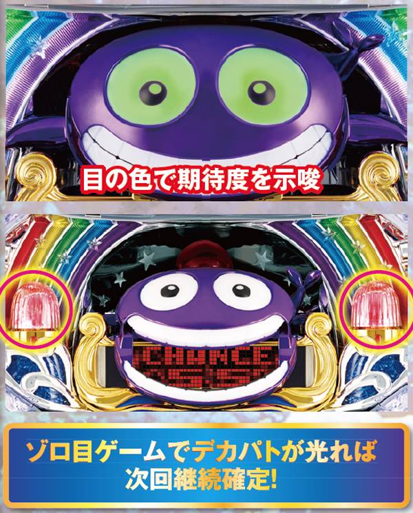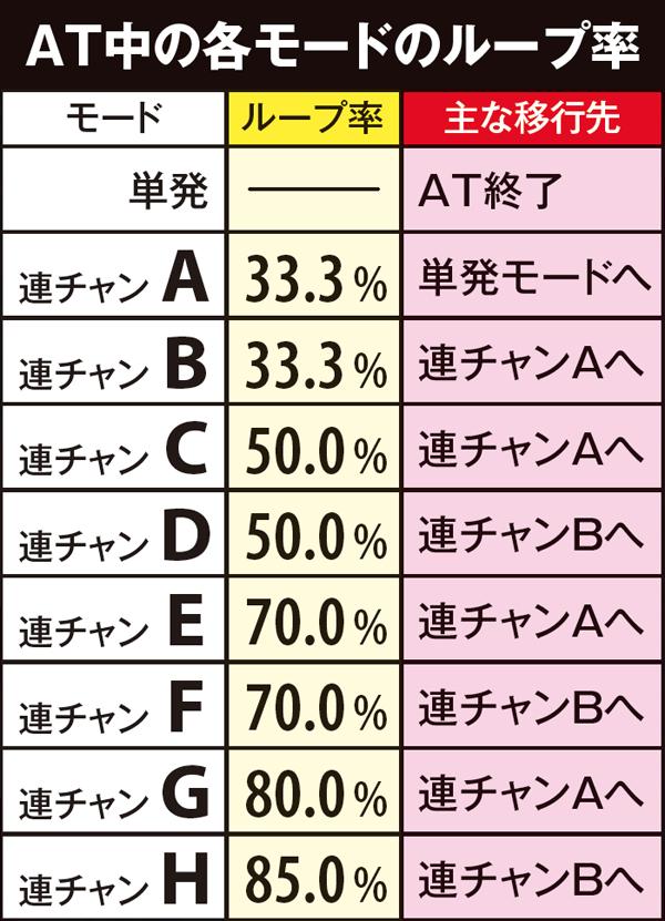 ATモードは全部で9種類あり、そのうち連チャンモードはループ率の違う8種類が存在している。上位モードほどループ率が高い=連チャンしやすくなっており、初当り時にそれを役物の目の色で示唆してくれる。白以外は連チャンモード確定で2連以上を保証、虹色の場合は最高の85%ループ確定だ。