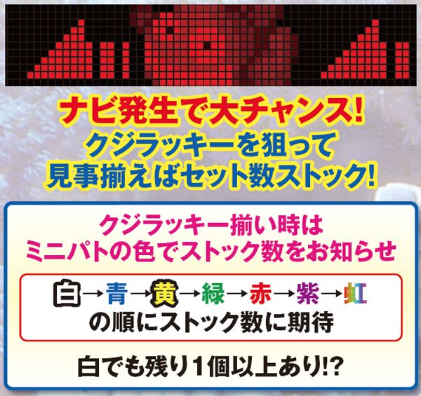 チャンス役やハズレ連続成立時にクジラッキーの目が光ったらストックチャンス。クジラッキーを狙えナビ発生時に見事揃えばストック確定だ。継続告知はゾロ目ゲーム数で発生するのでデカパトが光ることを祈ろう。
