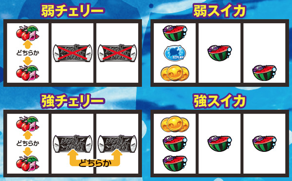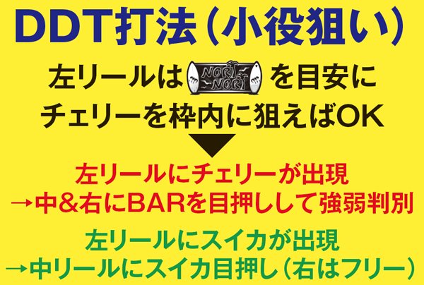 取りこぼし防止とペナルティが発生するCB入賞を防ぐためのDDT打法は上記の通り比較的簡単なのだが、強スイカを完璧に見抜くためには左リール中段にBARをビタ押ししなければならない。早目に押すと弱スイカの停止型になってしまう。