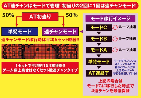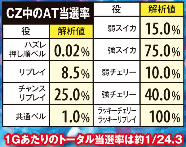 AT突入ルートは4つあり、メインとなるのは自力CZと規定ゲーム数消化。周期抽選が主な突入ルートとなるCZ中は、全役でAT抽選を行っているが、リプレイでチャンス、チャンス役成立で大チャンス到来となる。