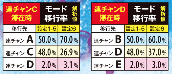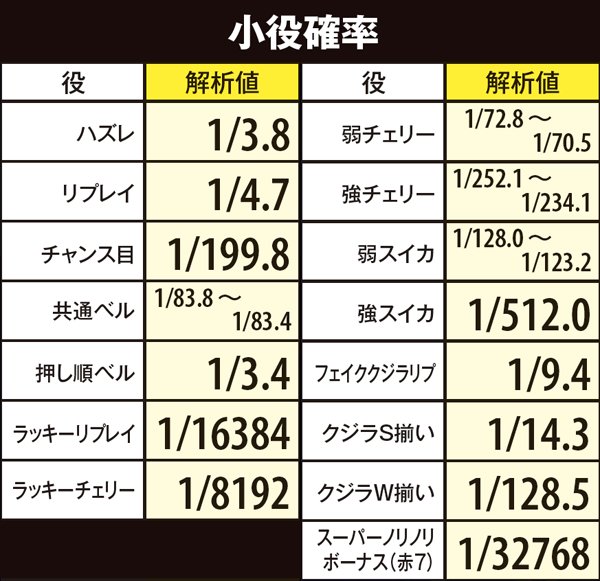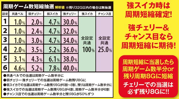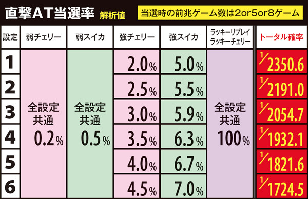 チャンス役による直撃当選には設定差が存在し、その差は強チェリー契機だと最大で2倍強。前兆ゲーム数を数えていれば見極めるのは容易なので、しっかりと確認するようにしよう。