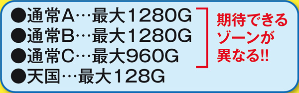 通常モード…1280Gハマリ。天国モード…128Gハマリ。