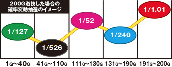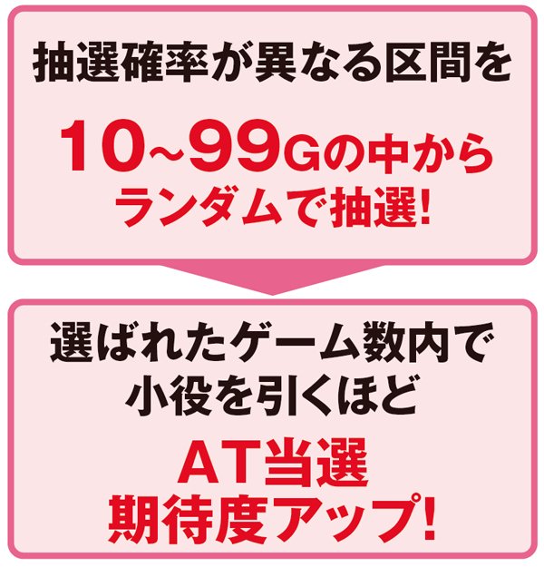 初当りの抽選システムは確率変動型。通常時のAT当選率は常に一定ではなく、10G~99Gの中からランダムで選択されたゲーム数以内に小役を引けば引くほどAT当選期待度がアップする。