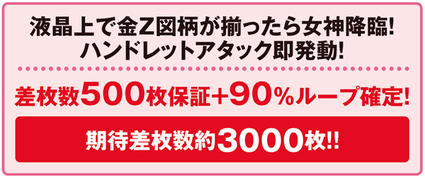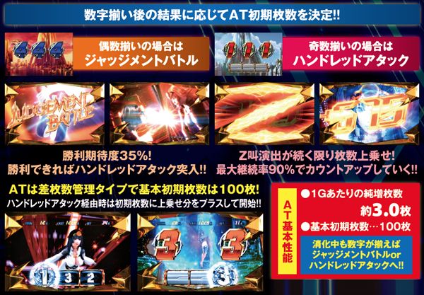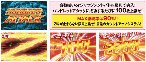 奇数揃い&ジャッジメントバトル勝利で突入する上乗せ特化ゾーン「ハンドレットアタック」は成功するたびに100枚上乗せ。Z叫が鳴り止まない限り上乗せカウントアップが続く仕様となっているので、MAX継続率の90%ならば一撃4桁以上の上乗せにも期待できる。