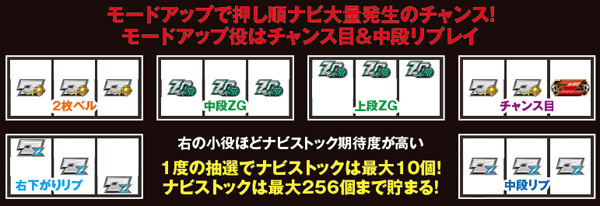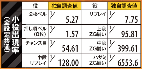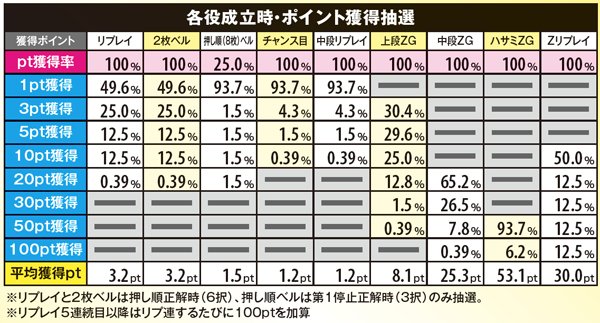 押した位置による小役の取りこぼしが無い仕様となっている本機だが、周期中のポイント獲得に関するチャンス役のうち「ハサミZG」だけは中リールに3連Zリプレイを目押ししないと成立が見抜けない。3連Z以外を狙った場合は外見上中段ZG揃いとなるが、払い出しによる損はなく、内部的に獲得できるポイントもハサミZGと同一となるので心配は無用だ。