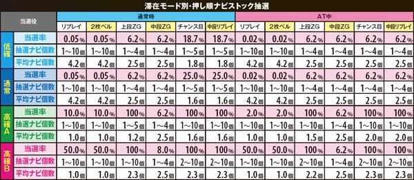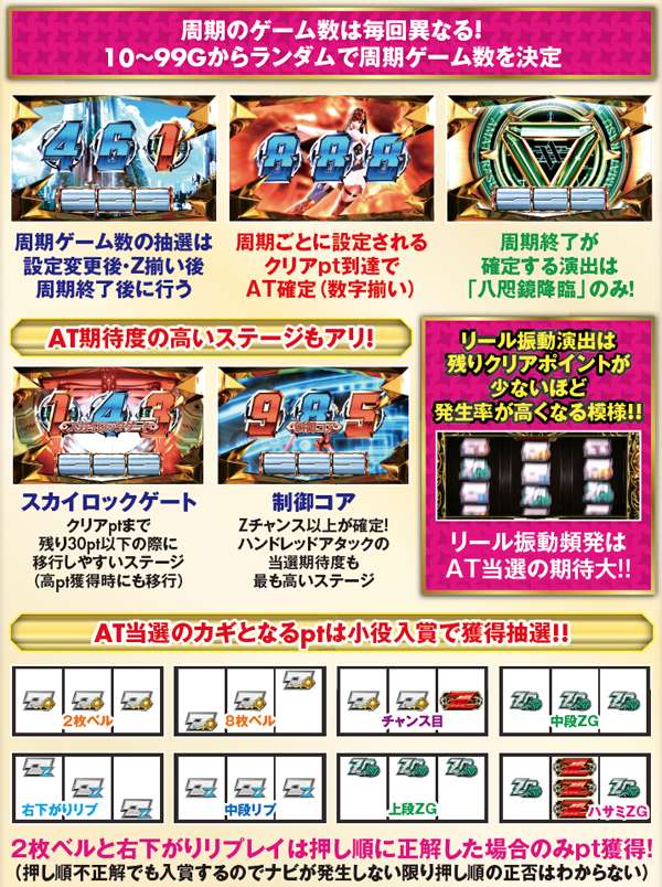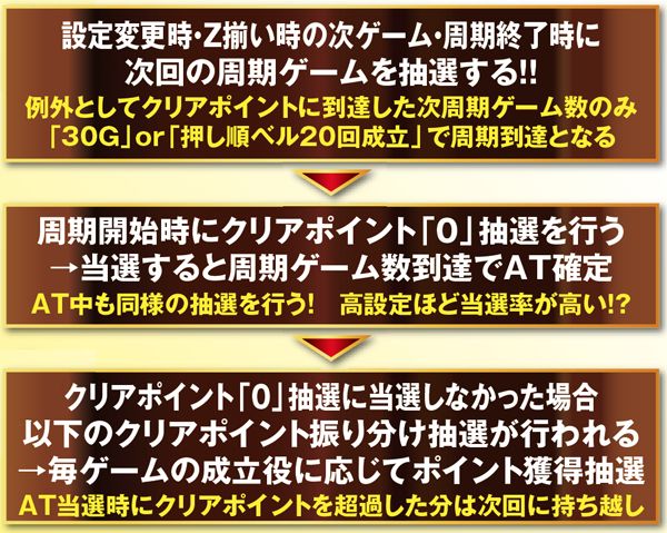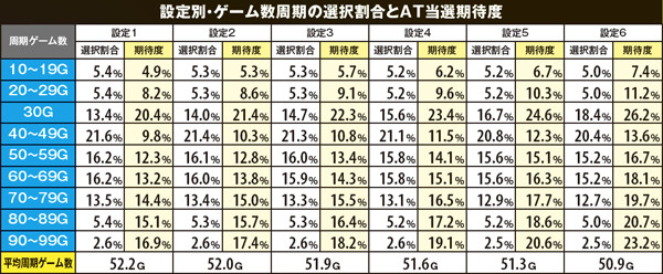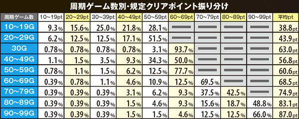 周期ゲーム数は短い方が得かと思いきや、各々のクリアポイントの平均値から1ゲームあたり何ポイント獲得しなければならないかを考えると、長い方が得。しかしハサミZGを引いた後は「短い周期であってほしい」と願いたくなるもの。ちなみに例外パターンとしてクリアポイントに到達した次周期ゲーム数(ATスタートG数)は30Gor押し順ベル20回成立で周期到達だ。