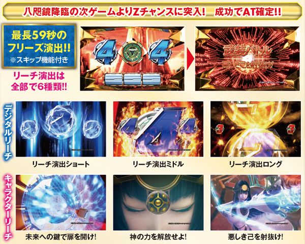 周期ゲーム到達が確定する八咫鏡降臨後はZチャンスに突入。その際のリーチ演出はデジタルよりもキャラクターの方が期待大。キャラクターリーチにはチャンスアップパターンもあるぞ。