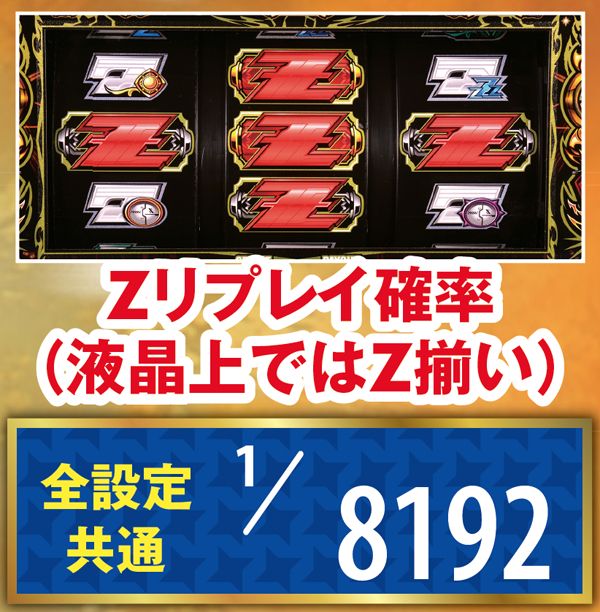 Zリプレイ成立時は、第1停止後にストップボタンが無効となり、水木一郎ボイスで「ゼーーーット!」とZ叫するのが代表的なパターン。Z揃い後は500枚保証+継続率90%確定のハンドレッドアタックに突入するので、大量の初期枚数からATをスタートさせることが可能だ。