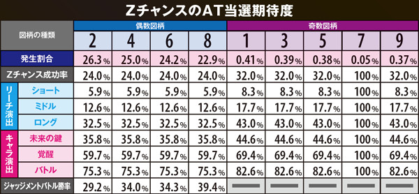 液晶に八咫鏡降臨で発生する「Zチャンス」のリーチ別信頼度は、上記の通り偶数奇数(7図柄以外)での違いだけ。しかしながら上乗せ特化ゾーンであるハンドレットアタックの突入期待度は偶数図柄の中でもだいぶ差があり、数字が大きい方が当選時の恩恵も大きいというわけだ。