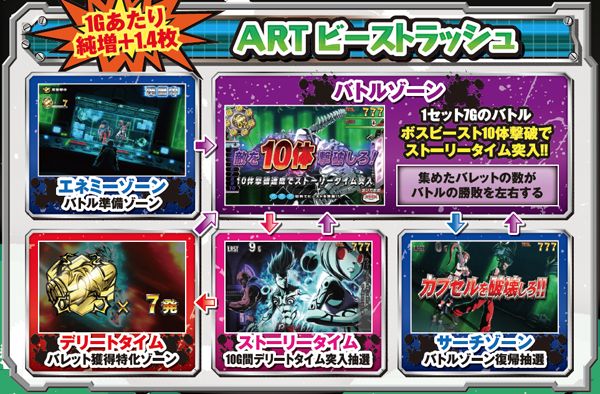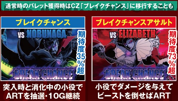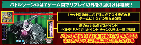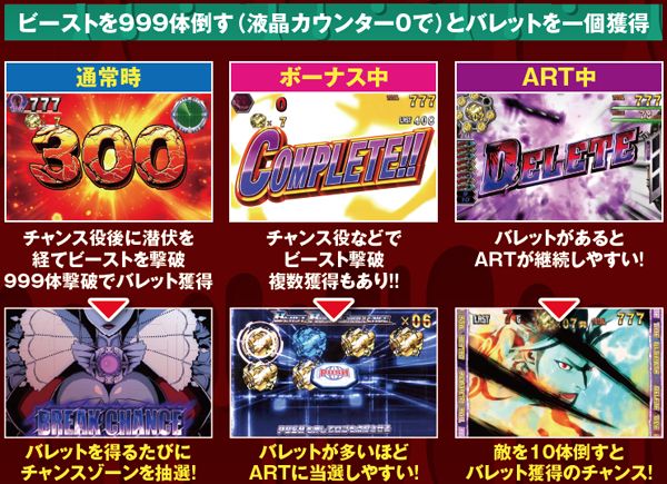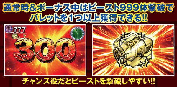 通常時はバレットを獲得する度にCZ抽選。ボーナス中はチャンス役の出現率が大幅に上がっているので、一気に大量のビーストを倒すことが可能……つまりバレット大量獲得の大チャンスだ。ART中のバレットは獲得数分だけART保証ゲーム数が延長される。