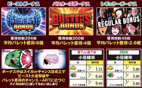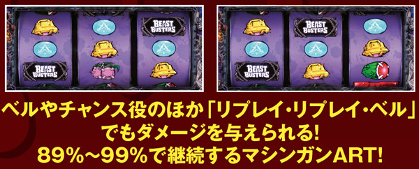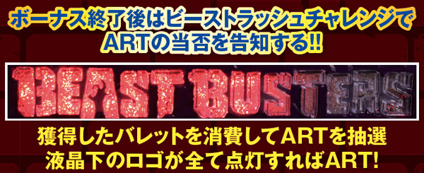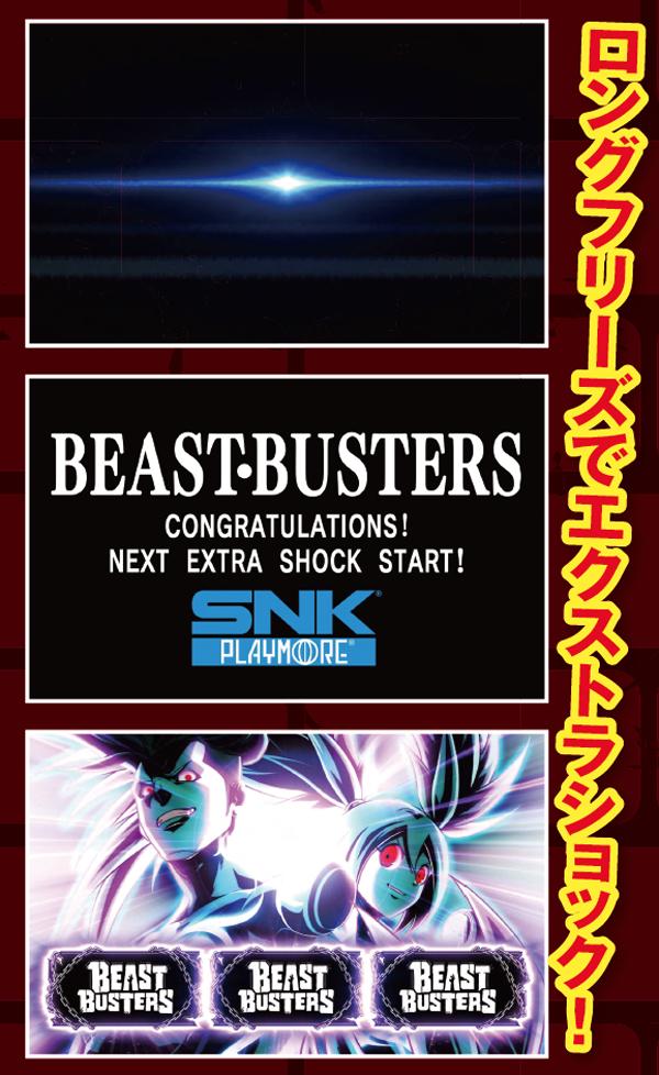 SNKプレイモアの『ビーストバスターズ』は、同名のアーケードゲームをモチーフにしたART機である。 通常時はハズレを含む全役でビースト撃破を抽選し、999体のビーストを倒せば「バレット」を獲得する。ここで獲得したバレットが多いほどART期待度が上昇し、ART突入後も集めたバレットの数がバトルの勝敗を左右する。 |
