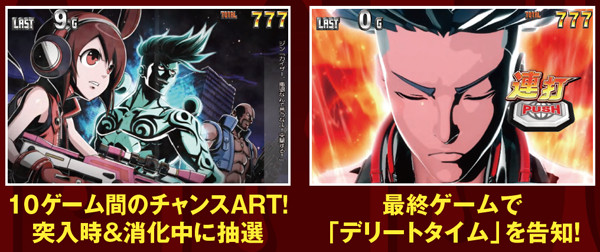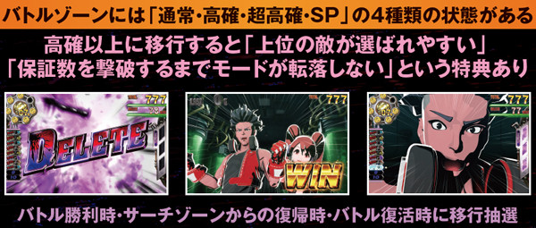 バトルゾーンとサーチゾーンが1セットになっており、バトルに敗北しないかぎりバトルゾーンがループする仕組みだ。また、デリートタイムに移行したら超激アツ。バレット大量獲得に期待できるので気合いを込めてレバーを叩こう。