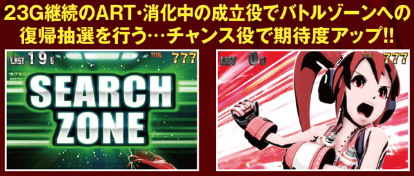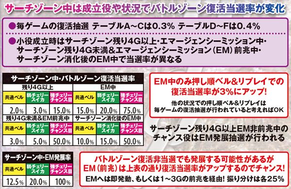 バトルゾーンの引き戻しに期待できる20G継続のサーチゾーン中は毎ゲーム復活抽選が行われている。押し順ベルやリプレイより、チャンス役の方が有利で、ボーナス当選なら復帰確定だ。また、チャンス役成立時には復活非当選でもEM発展の可能性あり。ただの演出というわけではなく、復活当選率がアップしているのでチャンス到来だ。