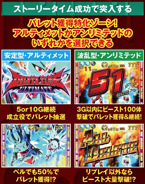 デリートタイムは突入すればバレット獲得のチャンス。安定と波乱の2タイプのうちいずれかを選択可能なので、好きな方を選ぼう。