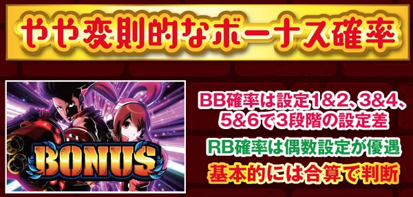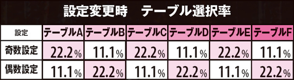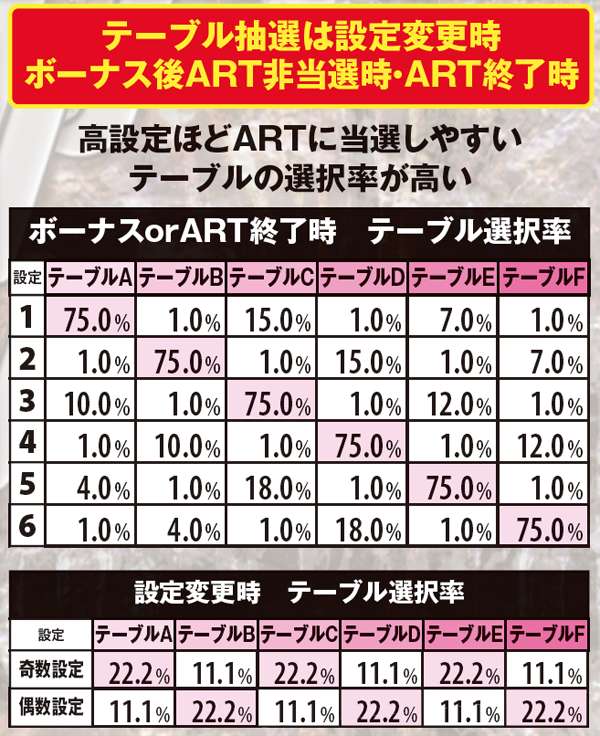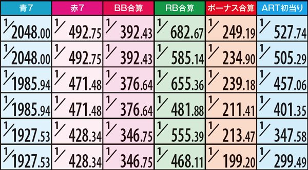 BB合算確率は基本的に高設定ほど高くなるが、REGのみ偶数設定の方が高めの数値となっている。台選びの際はボーナス合算と同時にREG出現率にも注目するべきだろう。もちろんARTの初当り出現率も重要だ。