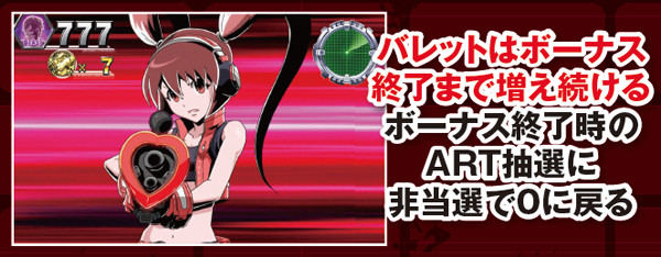 ボーナスはART突入の大チャンス。バレットも獲得しやすいので、いかに通常時にバレットを多く獲得した状態でボーナスを引けるかが勝負のカギを握る。12個貯まればART確定だ。