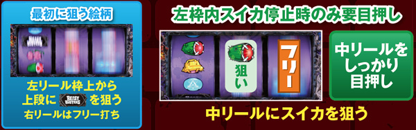 小役狙いは左枠内にチェリーを狙い、スイカ出現時のみ右をフリー打って中リールはボーナス絵柄を基準にスイカを狙えばOK。変則押しも可能となっており、中リールにBARを狙って中段に停止すればチャンス役以上。成立すればチャンス目となる1枚役も打ち方次第で奪取可能となっている。