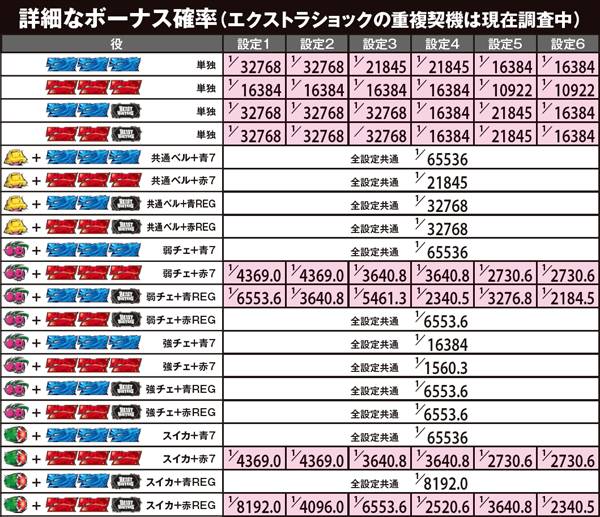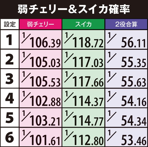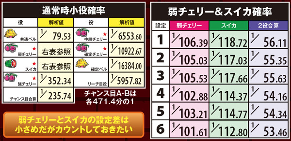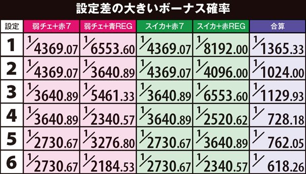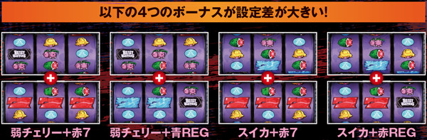 特定役とボーナスの重複出現率に設定差アリ。設定1と6で2倍近くの差があるので、出現率をチェックしつつ打ちたい。もっとも設定差が大きいスイカ+赤REGを1回でも引ければチャンスだ。