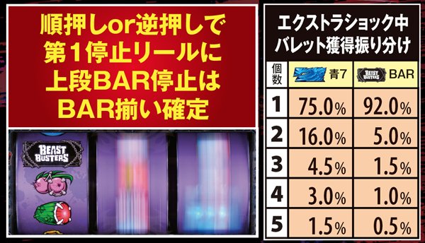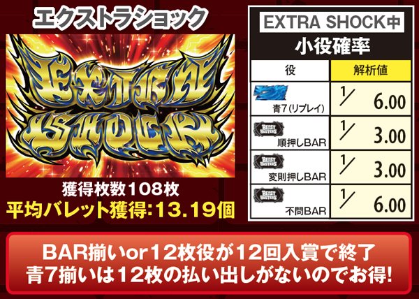 エクストラショック中のBAR揃いには押し順の概念があり、左or右からの2択と押し順不問BARが存在。押し順不問BARならバレット確定だ。青7はリプレイ揃いなので引けば引くほどお得となる。