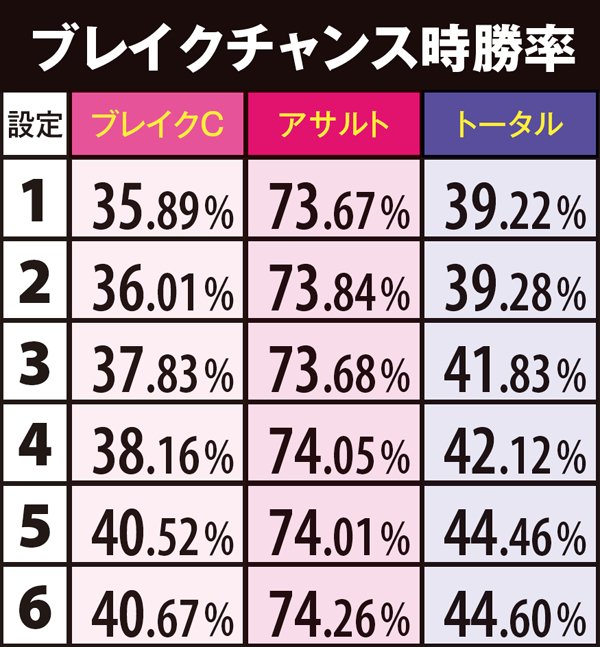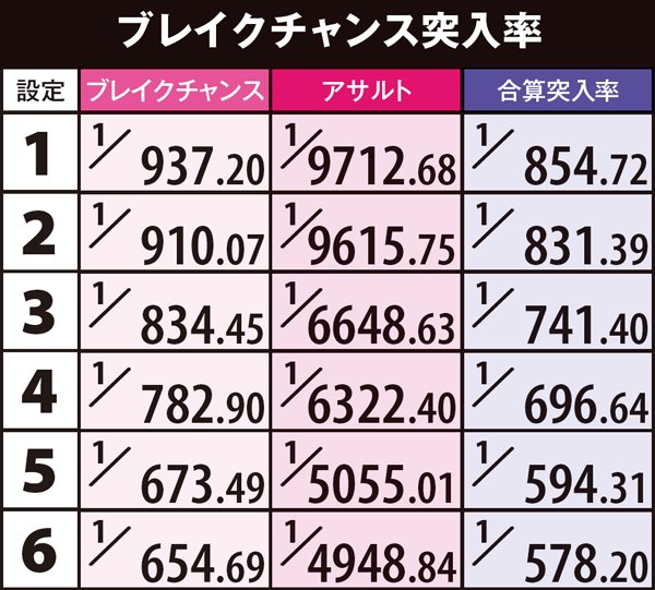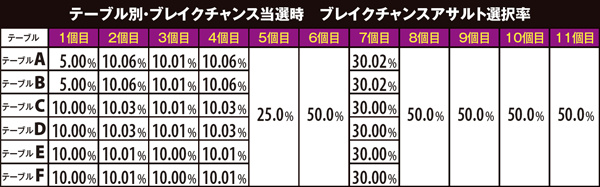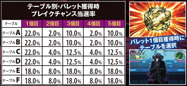 ART当選期待度の高いブレイクチャンスアサルト当選率もテーブルで管理されている。1~4個目のバレットではあまり当選しないが、5個目以降は一気に当選率がアップする。