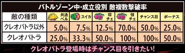 バトルゾーン中はセット内でリリべorベルを3回引ければART継続確定となるが、チャンス役なら成立した時点で1体以上撃破確定。クレオパトラとのバトル時にチャンス役を引ければ複数撃破の可能性大となる。