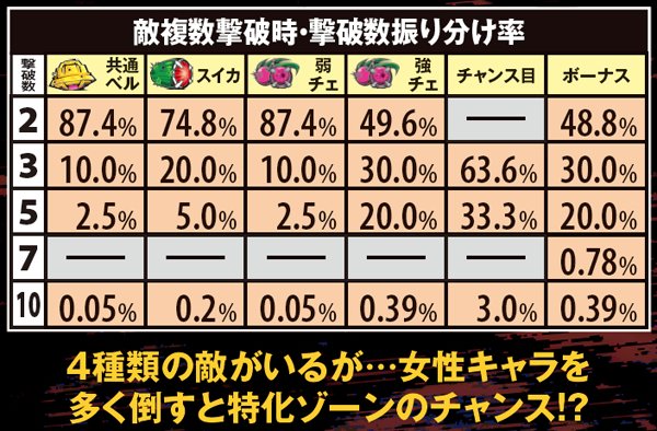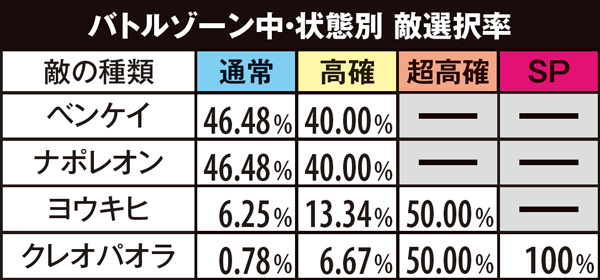 ヨウキヒとクレオパトラは高確以外では出現率が低く抑えられている。超高確ならばヨウキヒorクレオパトラのみが出現するようになり、SPに移行していればクレオパトラのみが出現する。超高確で敵を複数撃破した場合、ヨウキヒorクレオパトラ撃破となるので特化ゾーンのチャンスとなる。